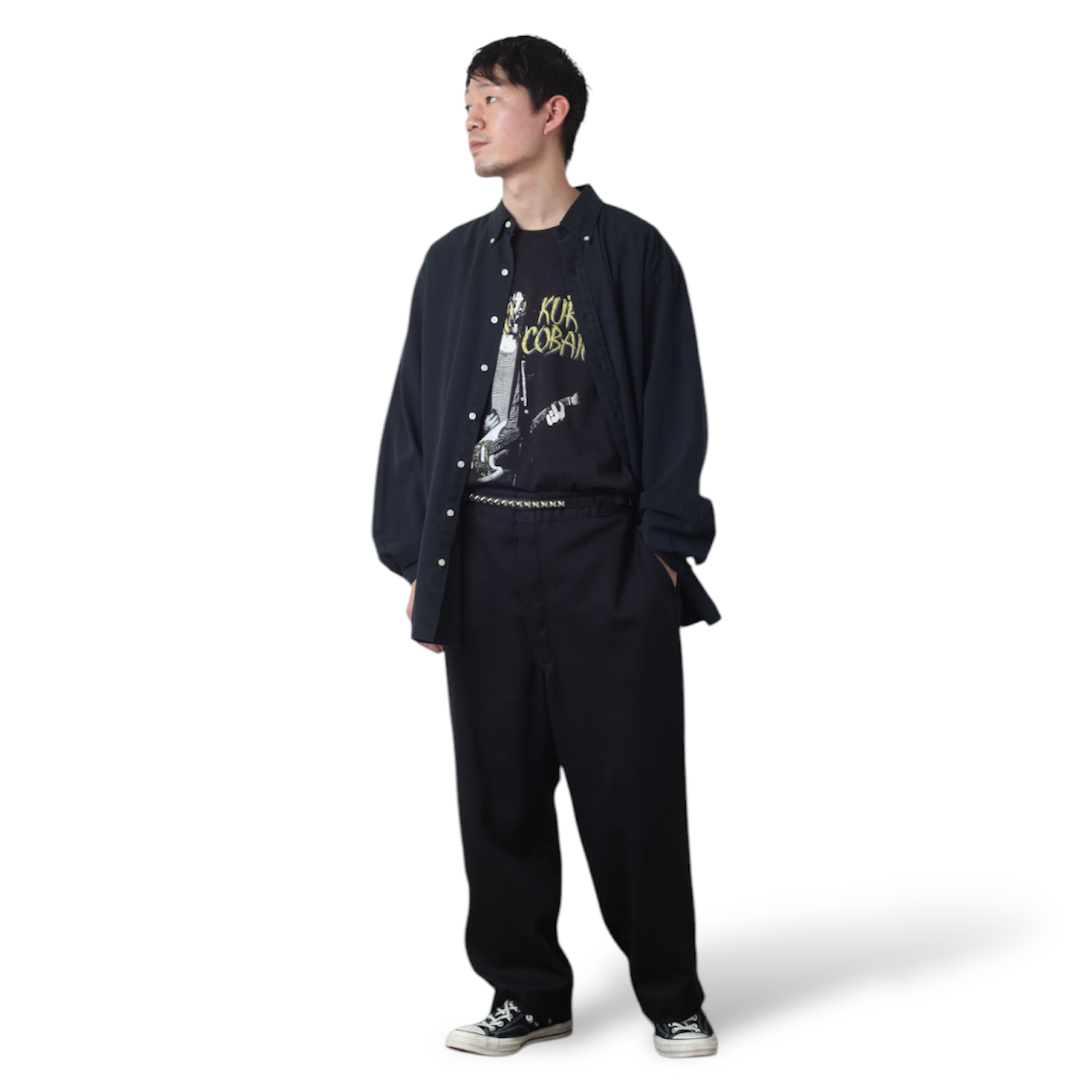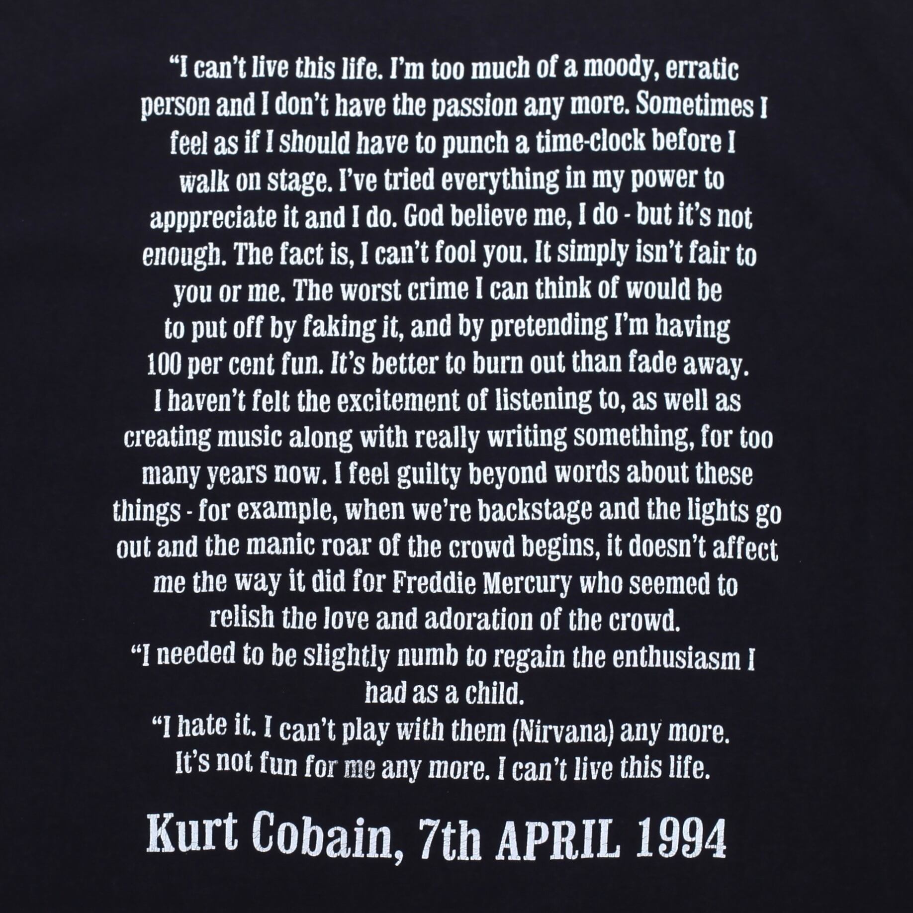 フロントには非常に珍しい右利きスタイルのカートコバーン(鏡なのか、ネガに色をつけたのか定かではないですが)がプリントされ、バックにはカートコバーンの遺書の文がプリントされたスペシャルな一着。