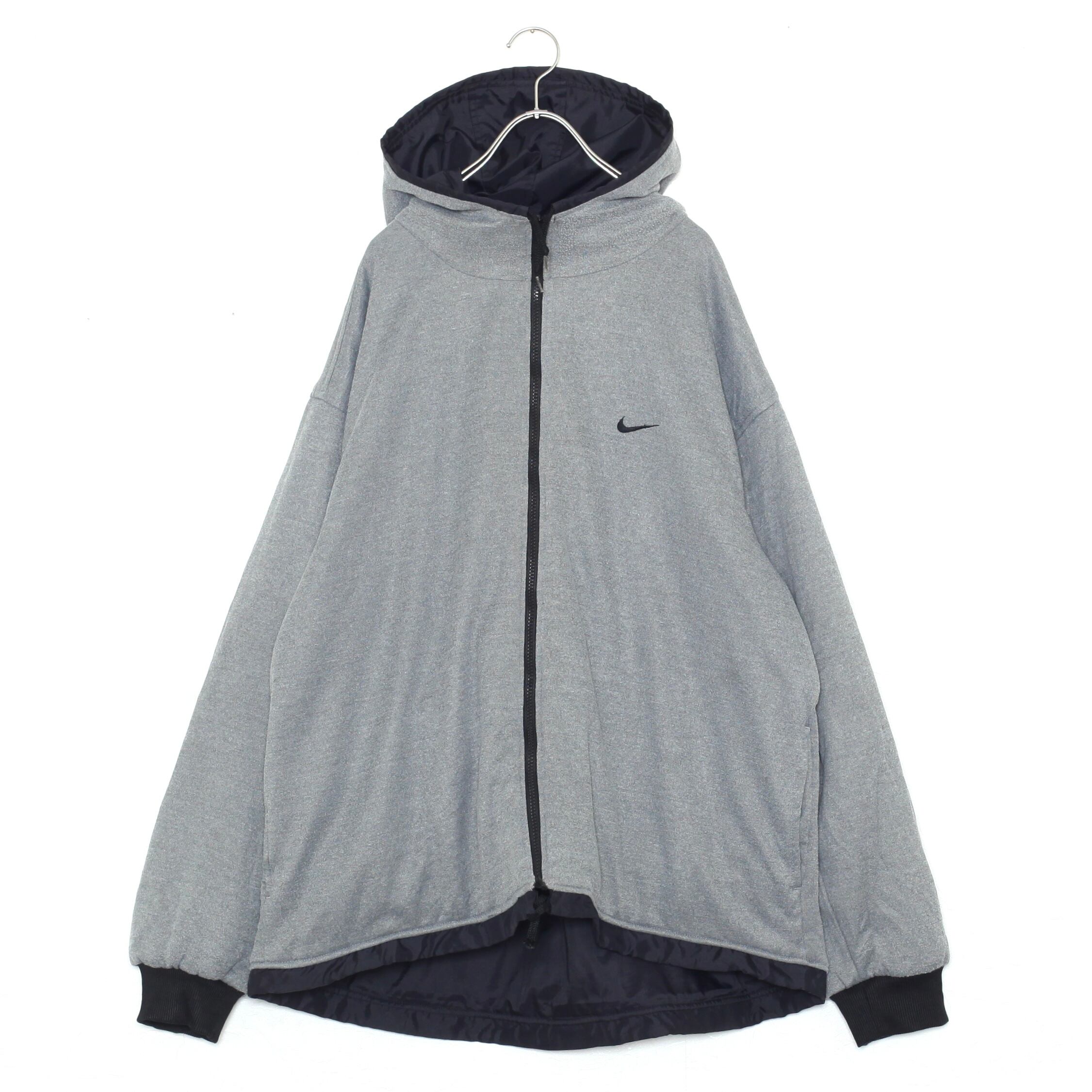 古着 90年代 90s ナイキ NIKE ナイロン スウェット リバーシブル フーデッド ジャケット 白タグ フード パーカー フーディー ジップアップ フルジップ 中綿 無地 ソリッド スウォッシュ ロゴ 刺繍 ブルゾン アウター コットン ポリエステル ブラック 黒 グレー 灰色 メンズ L 大きい サイズ ビッグ シルエット オーバー ヴィンテージ ビンテージ オールド レギュラー 中古